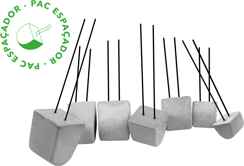O PAC Espaçador, conhecido também como Distanciador Universal, pode ser usado em todos os elementos de concreto e para qualquer diâmetro de barra de aço, pois ele é amarrado no cruzamento de estribo ou cruzamento de estribo com a barra principal, substituindo o ponto do arame recozido.